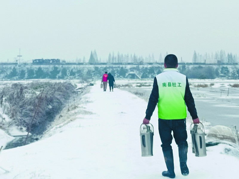 2月7日,受低温雨雪冰冻天气影响,在杭瑞高速湖南益阳南县麻河口镇向阳村路段,许多返乡人士被困高速饥寒交迫。村民汤光辉看到大量车辆滞留后,立马组织附近的村民,冒着风雪为旅客们送去免费的热水和食物。“爱心送餐”行动一直持续5个小时,直到12时高速陆续畅通后,旅客们纷纷开窗告别,载着温暖踏上归乡之途。图为村民送餐的背影。 赵园 摄