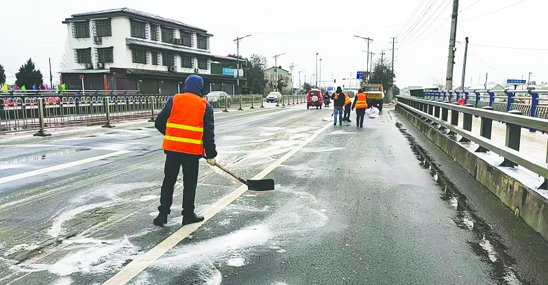 2月22日,赫山区公路建设养护中心龙光桥公路站的工作人员正在国道536线兰溪桥紧张工作,撒布融雪剂融雪花防冻,尽管桥面潮湿,但车辆可以慢行安全通过。