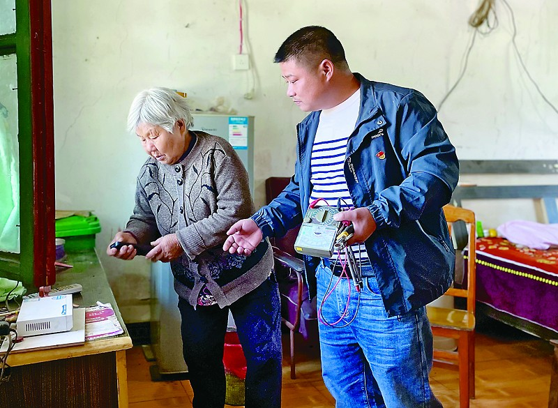 邓敏丰帮老人修家电。陈徐文倩摄