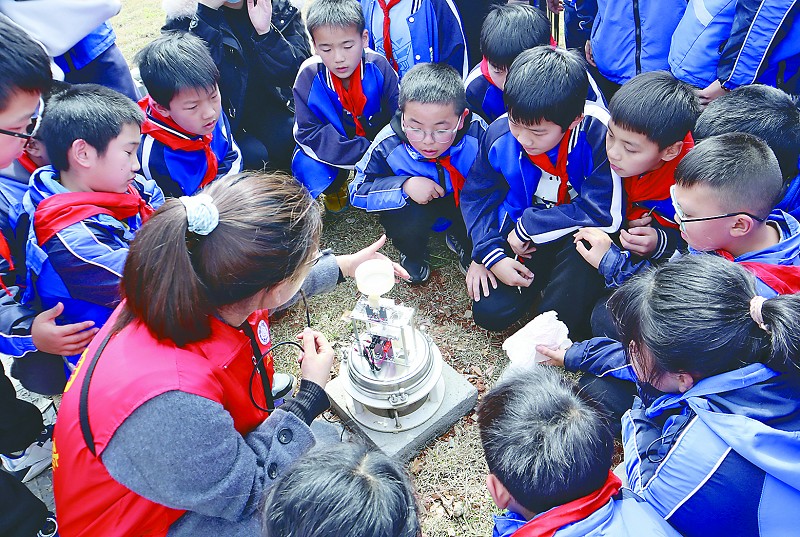 “这就是草温传感器,别看它跟普通的泥巴地差不多,里面可大有玄机。”3月20日,赫山国家基本气象站来了一群“红领巾”。大家围绕着形态各异的气象探测仪器,一边听志愿者讲解,一边好奇地观察。