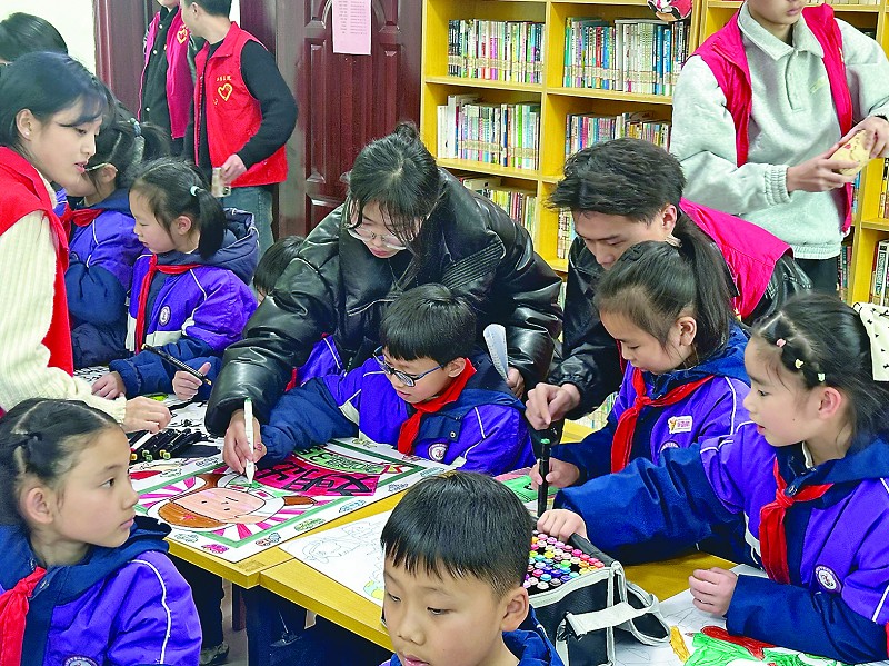 ▲ 大学生志愿者和丁香小学学生一起绘制文明标语海报。 李胜利摄