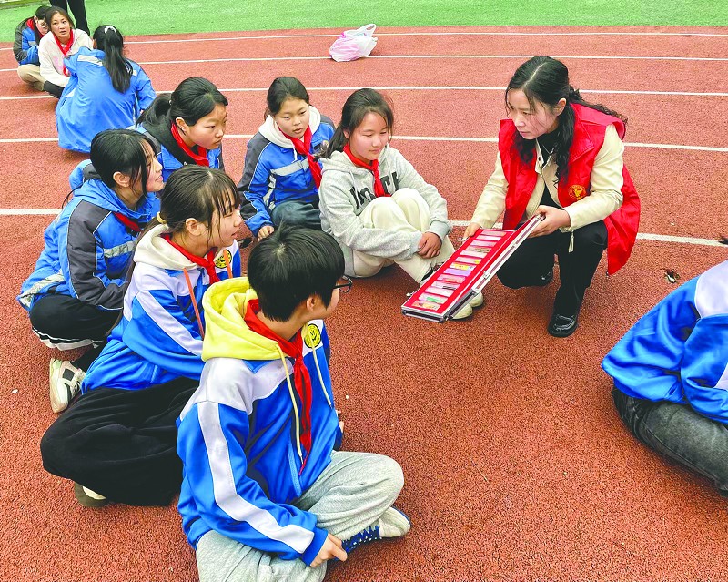 禁毒志愿者向学生展示毒品仿真模型。周琳摄
