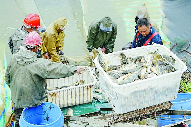 3月27日,南县麻河口镇南湖千亩渔场内,养殖大户刘海波与10多位渔民一起放网捕鱼。随着渔网收缩,肥美的鱼儿浮出水面,翻腾跳跃,大家合力将鱼抬上岸分解、称重、装车,忙得不亦乐乎。