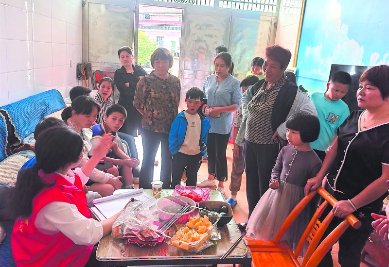 同样的场景还在上演。在四年级学生符文翔家,在他妈妈符雪姣的召集下,操坪上、客厅里,来了不少家长和孩子,大多是爷爷奶奶,也有的是夫妻一齐出动。因为乡间的路不好走,弯弯拐拐,钟爱群和邓觉风赶到时,他们已经等候了一段时间。