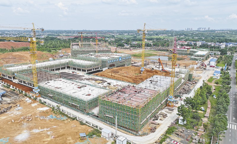 7月15日,夏日炎炎、热浪滚滚,在益阳龙岭产业开发区的江丰学院、湖南速特自动化有限公司一期项目建设现场,塔吊林立、机器轰鸣,建筑工人正在进行吊装、加固、焊接作业,现场一派热火朝天的景象。