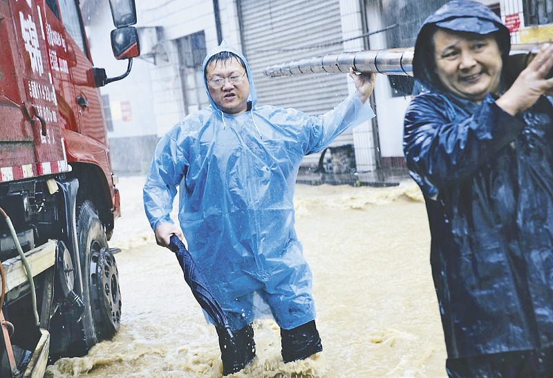 龚坚强(左)和干部群众在洪水中运送物资。夏国安摄