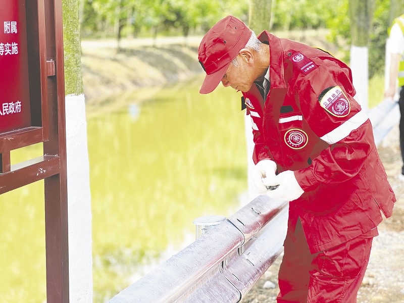 ▲ 工作人员在烈日下加固道路安防设施。 刘舒婷摄