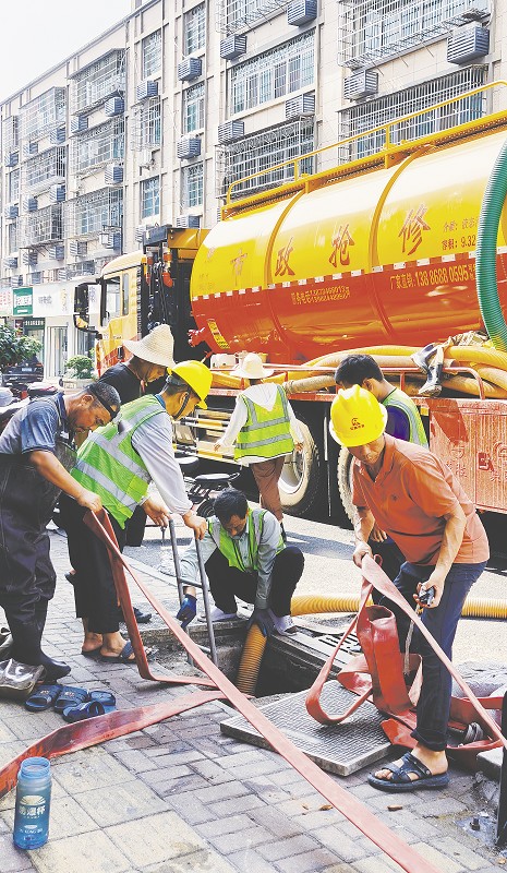 为补齐城市基础设施短板,完善城市服务功能,提升城市品位,增强群众的获得感和幸福感,大通湖区投资5040万元的中心城区北部排涝系统工程于4月29日动工建设,在项目新建和管网改造的基础上,再对29处排水泵站、闸门、沿河排放进行智能化改造,目前共完成投资2600万元,预计12月底竣工。图为8月20日,工人们实施下水道清污。