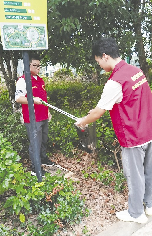 大学生志愿者在捡拾垃圾。陈浩军摄