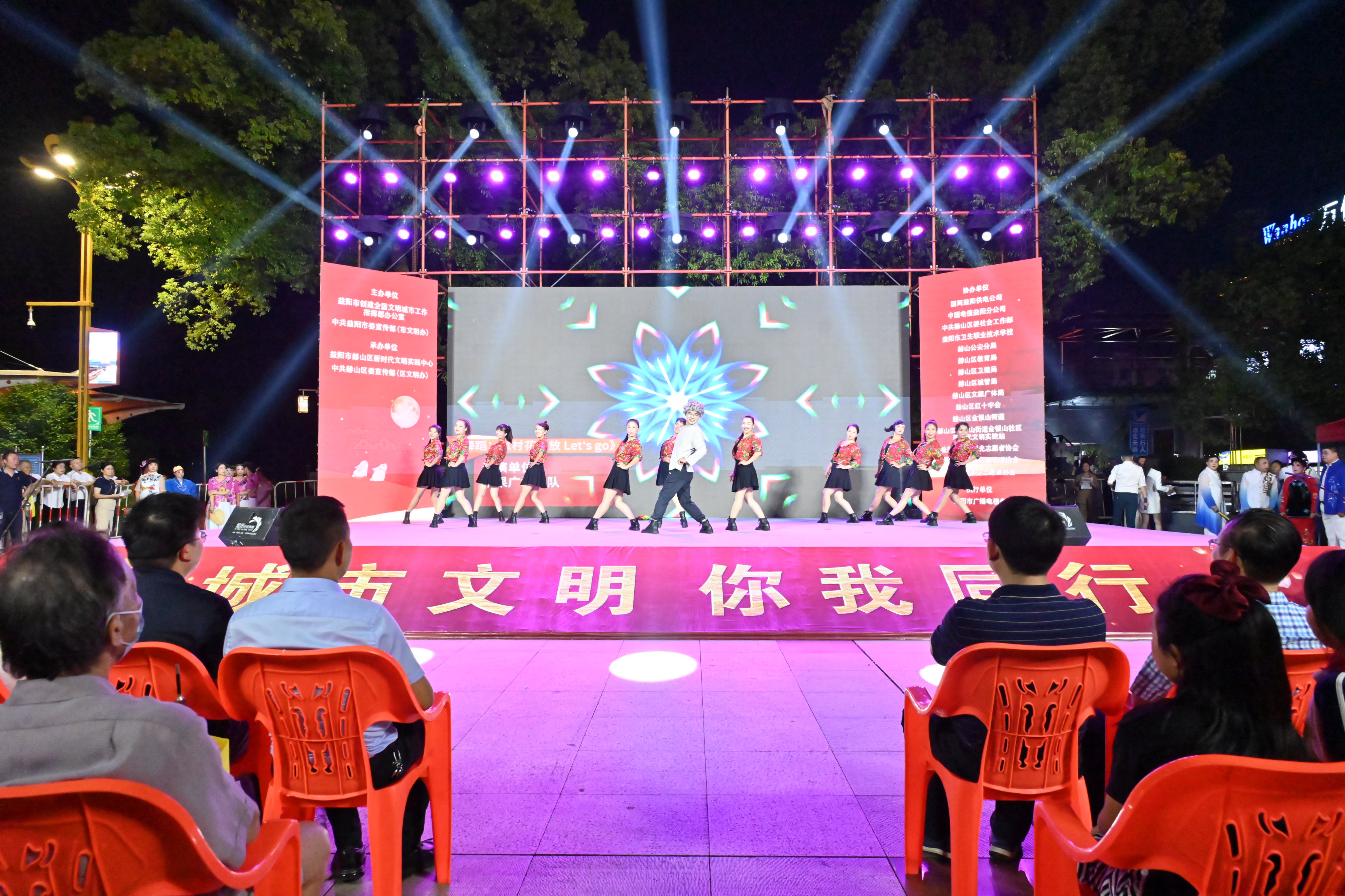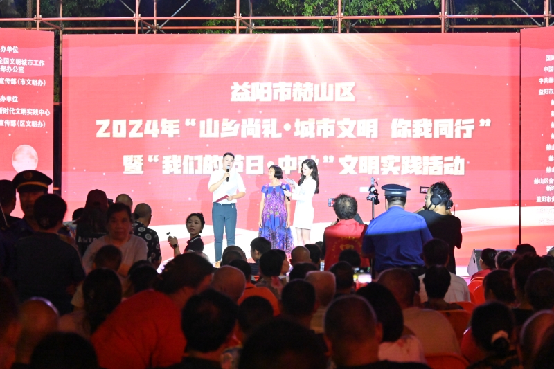 9月13日18时许,位于中心城区金山路旁的秀峰公园西广场热闹非凡,上千名群众早早来到这里,等着参加即将举行的赫山区2024年“山乡尚礼 城市文明 你我同行”暨“我们的节日 中秋”文明实践活动。19时整,晚会正式开始。率先登场的是广场舞达人“益阳果果”,他带着十几名“村花”,跳起了动感十足、趣味盎然的广场舞。