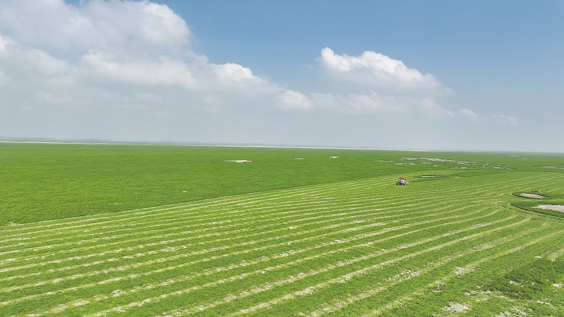10月8日,在南洞庭湖自然保护区舵杆洲区域,管理站工作人员正收割老苔草,确保候鸟越冬时“口粮”充足。