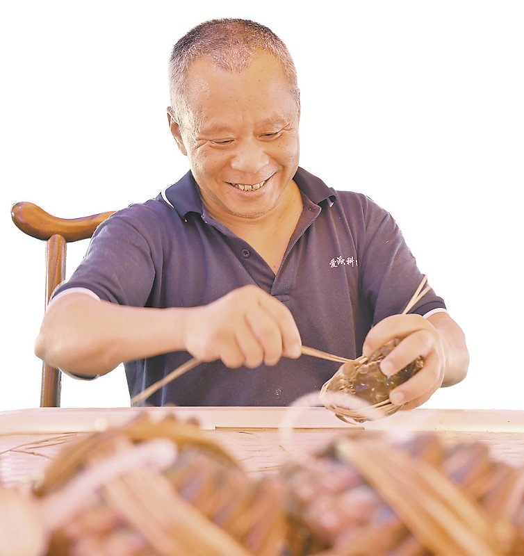 蟹农开心地用水草绑住大闸蟹,并挂上国家地理标志保护产品标牌。吴胜琳摄
