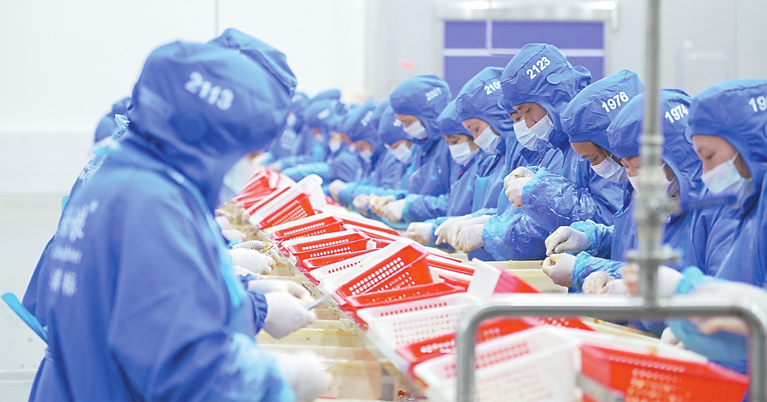 在顺祥食品有限公司的小龙虾生产车间,工人们正在剥虾。