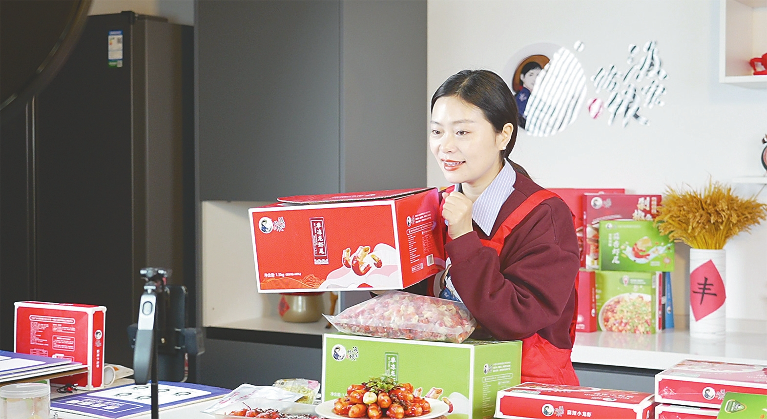 网络达人在直播间推介稻虾系列商品。