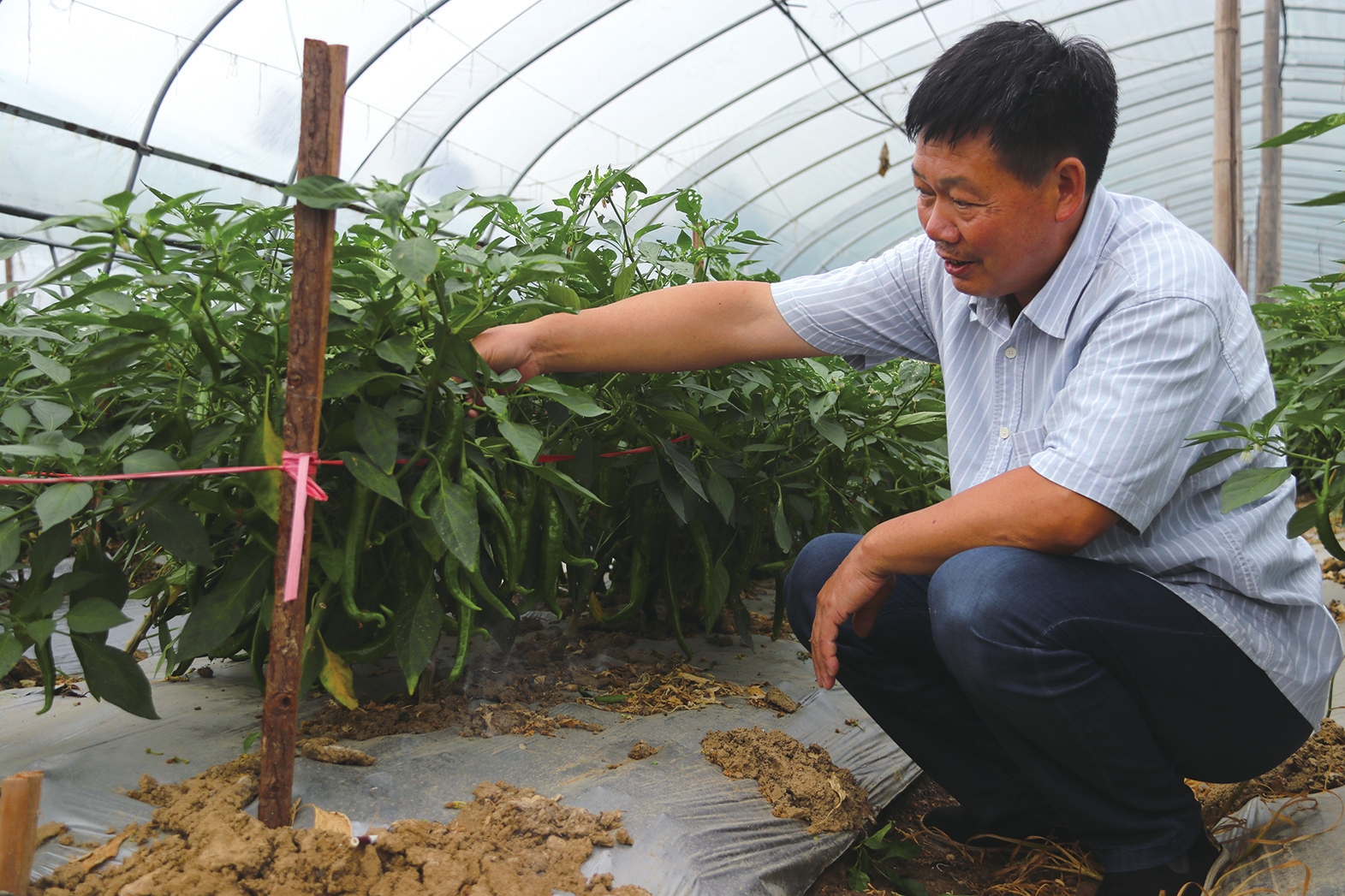 卢和平在蔬菜基地观察辣椒生长情况。卢静摄