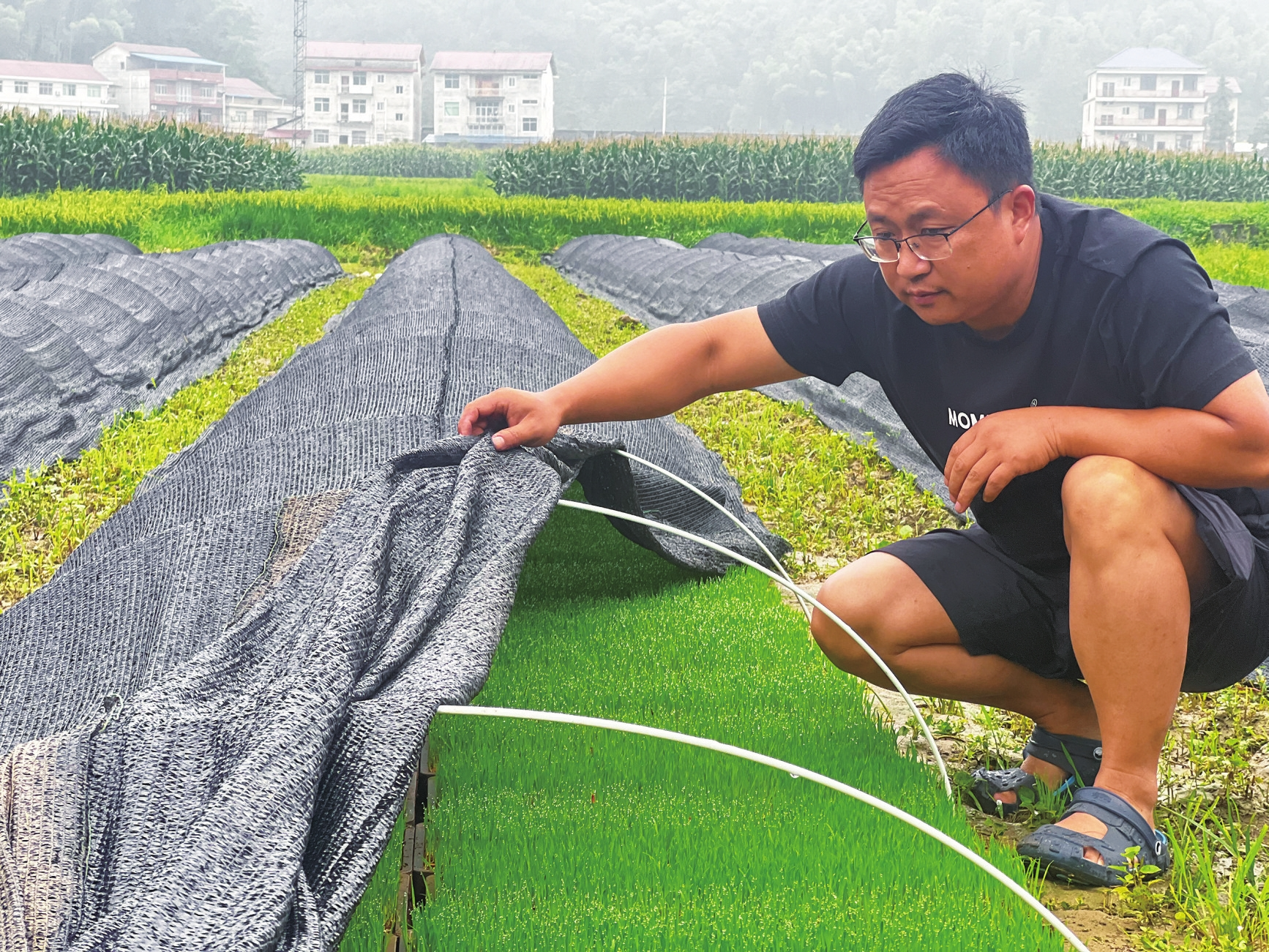 6月26日,在安化县田庄乡笔峰村垦田人农机农技种养专业合作社,负责人蒋彪蹲在田间仔细观察秧苗的生长状况。连日来,合作社抓住有利天气,紧张有序地进行晚稻育秧工作,从浸种消毒、催芽拌种到摆盘盖土、搬运秧盘,一系列育秧工序井然有序,田间地头呈现出一派繁忙景象。蒋彪表示,合作社采用了先进的育秧技术和设备,整批秧盘的出货率高达95%以上。甘果摄