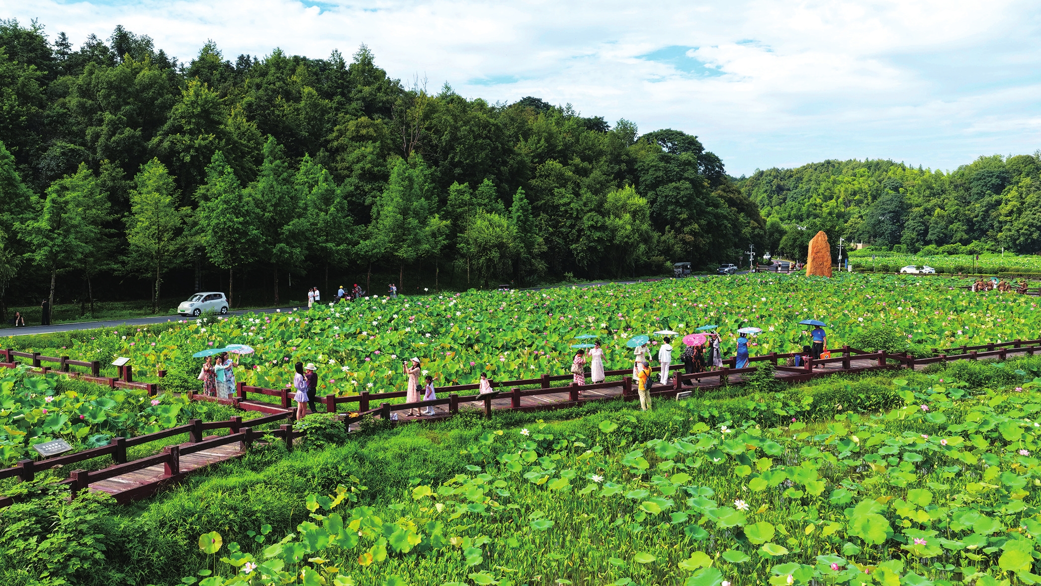 盛夏时节,赫山区谢林港镇清溪村百亩荷塘迎来盛花期,粉白相间的荷花在碧叶间亭亭玉立,暗香浮动。游客在吸吮“文学之乡”的书香后,漫步在荷田中的木质栈道上,以青葱树林为背景,记录下“映日荷花别样红”的诗意画面。书香与荷香在此交织成独特的夏日记忆。