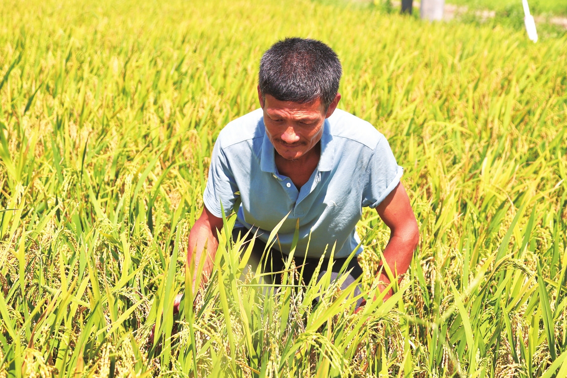 刘征宣下田查看早稻长势。陈徐文倩摄