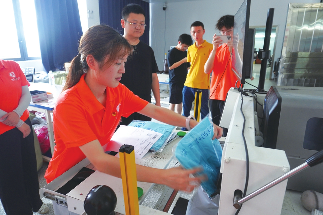 实践团成员在湘银之舞学习操作快递全自动打包机。周楚钦摄