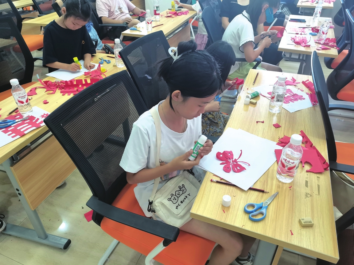 孩子们用心制作剪纸。周琳摄