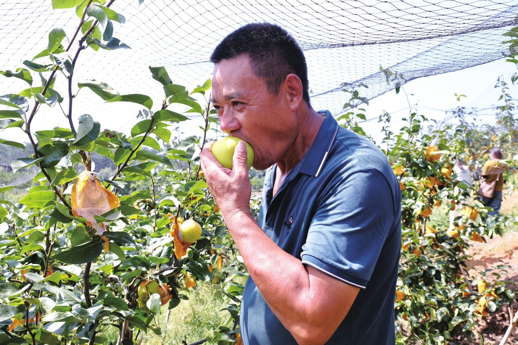 刘学明品尝成熟的翠冠梨。陈徐文倩摄
