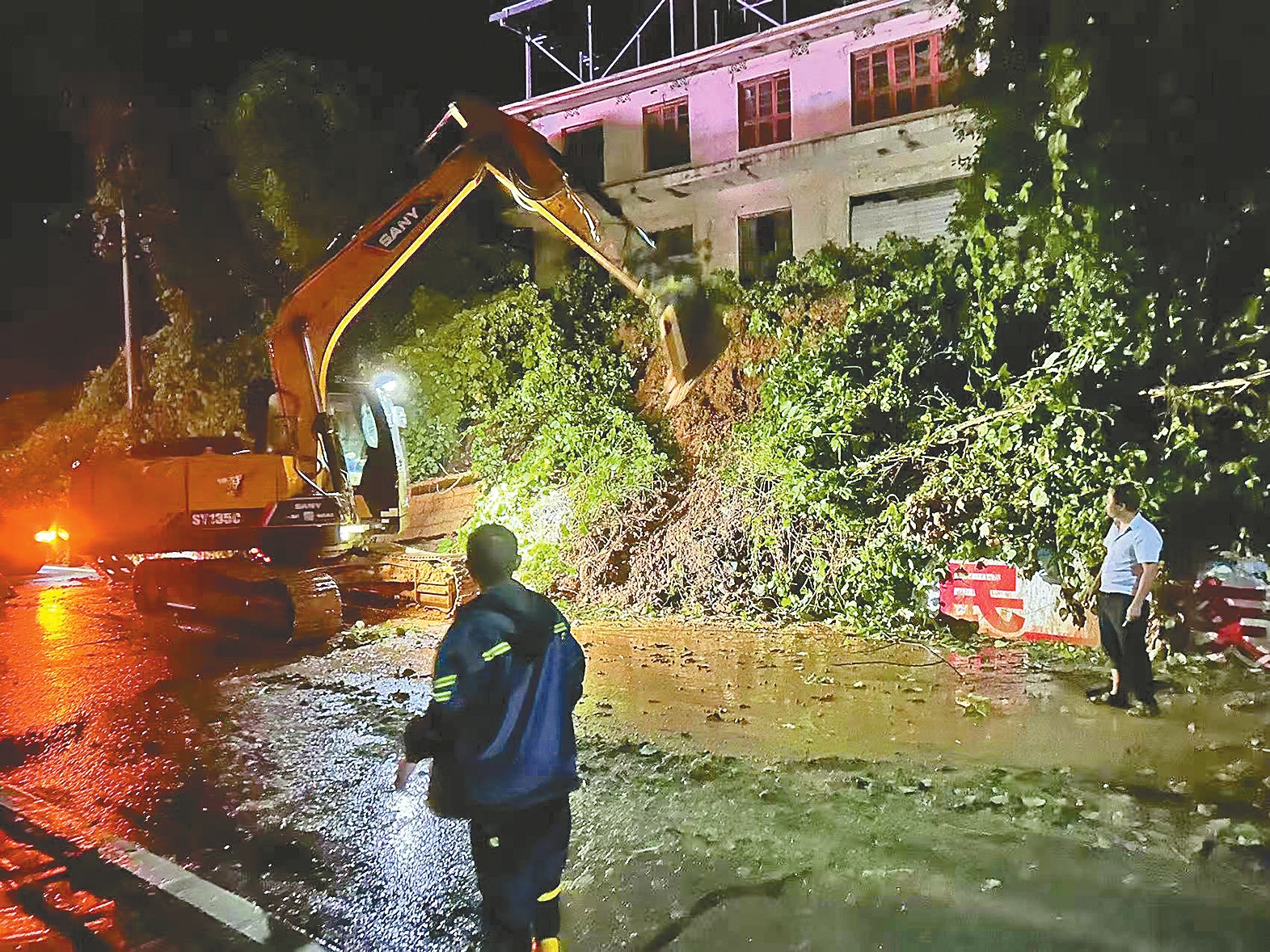 7月22日零时30分左右,桃江县鲊埠回族乡应急抢险队连夜调配挖掘机,冒雨紧急清障。(桃江县鲊埠回族乡提供)
