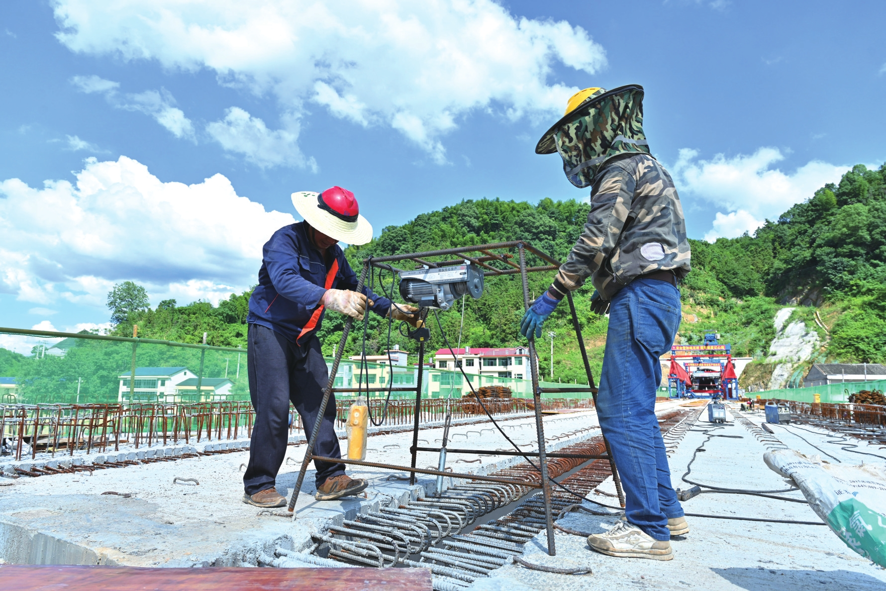 ▲建设中的洢水大桥上,工人正在绑扎湿接缝钢筋。