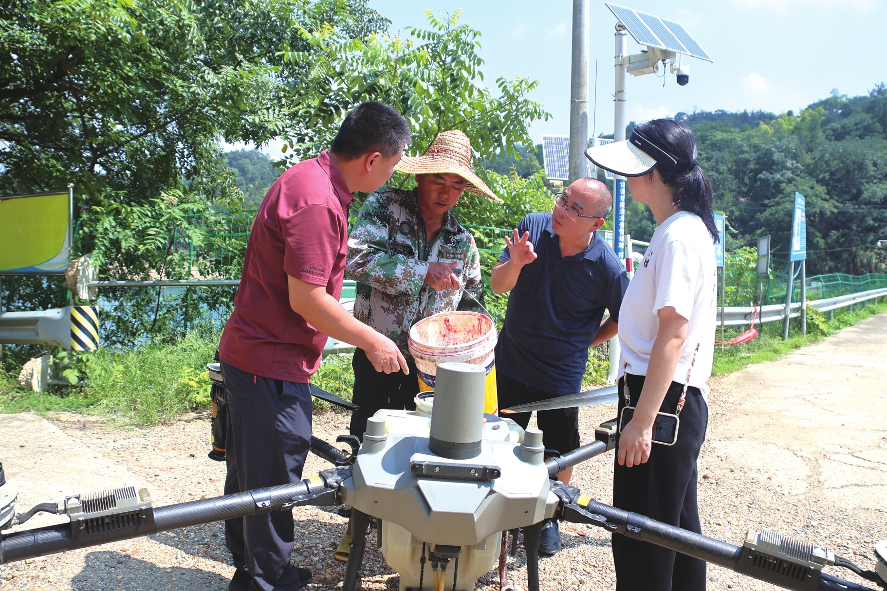 在现场,技术人员将印楝素杀虫剂与水按比例混合后,溶液迅速乳化,没有任何刺激性气味。飞防操作人员仔细检查无人机的喷洒系统和药箱,确保机械设备设施完好,药剂能够均匀喷洒到竹林各处。