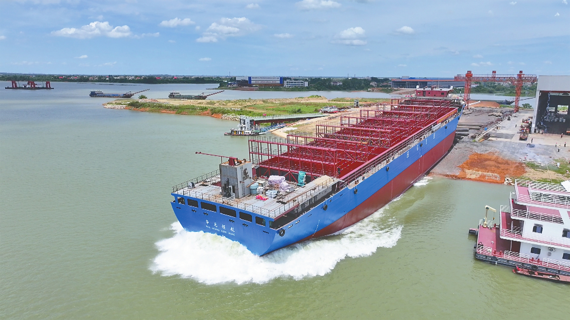 8月15日,长江内河最大吨位集装箱船“华光领航号”在沅江船舶工业园顺利下水。