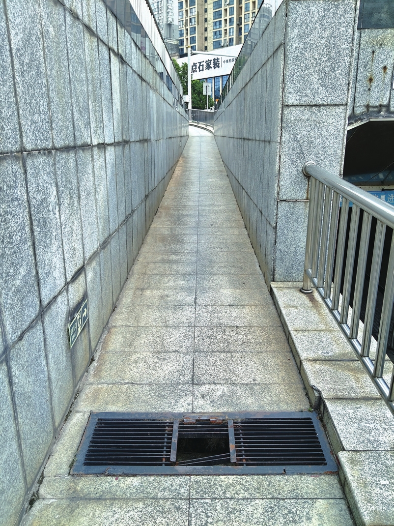 在益阳大道与康富路靠益阳华天大酒店一侧的地下通道自行车道入口,下坡段的一处排水口铁井栏中心位置断裂缺损严重,自行车和电动自行车经过此处有摔倒的安全隐患。提示骑车经过此处的市民,务必提前减速或下车推行,以免摔碰受伤。同时希望市政部门尽快修复或更换铁井栏,以确保市民的安全出行。