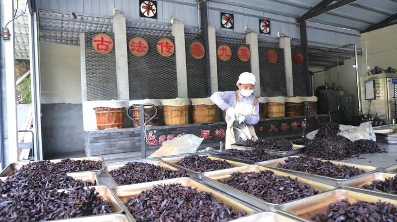 不只是药用,黄精还是梅山先民的救命粮。《救荒本草》里,黄精位列“仙救饥”之首,在灾荒年代,安化人靠挖黄精、煮黄精渡过难关。如今,在辰峰谷的生产车间,仍能看到工人们遵循九蒸九晒的古法:白天把黄精蒸熟,让糖分充分渗出;晚上放在竹匾里曝晒,吸收夜露的湿气;反复九次后,黄精变得黑润油亮,入口甘甜。目前,安化黄精九制传统技艺已入选湖南省非物质文化遗产保护名录。