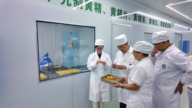湖南省中医药研究院中药资源所所长张水寒(左一)在博瑞黄精丸生产车间指导生产。