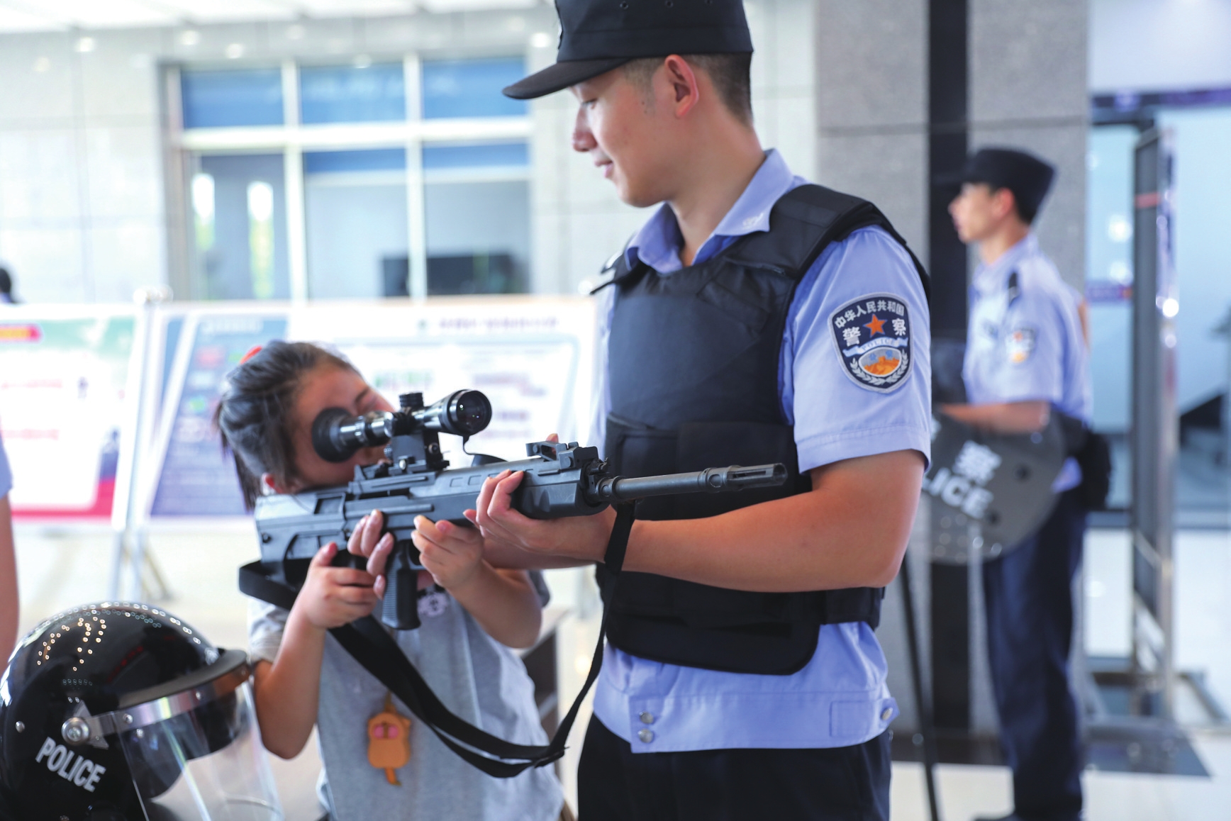 孩子在警察的指导下接触枪支。李仁吉摄