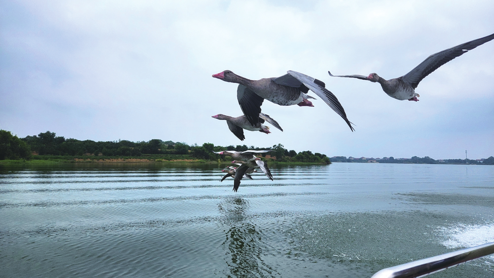 南洞庭飞鸟乐园,一行大雁随游艇伴飞,展示人与动物和谐共处的乐趣。孙殉华摄