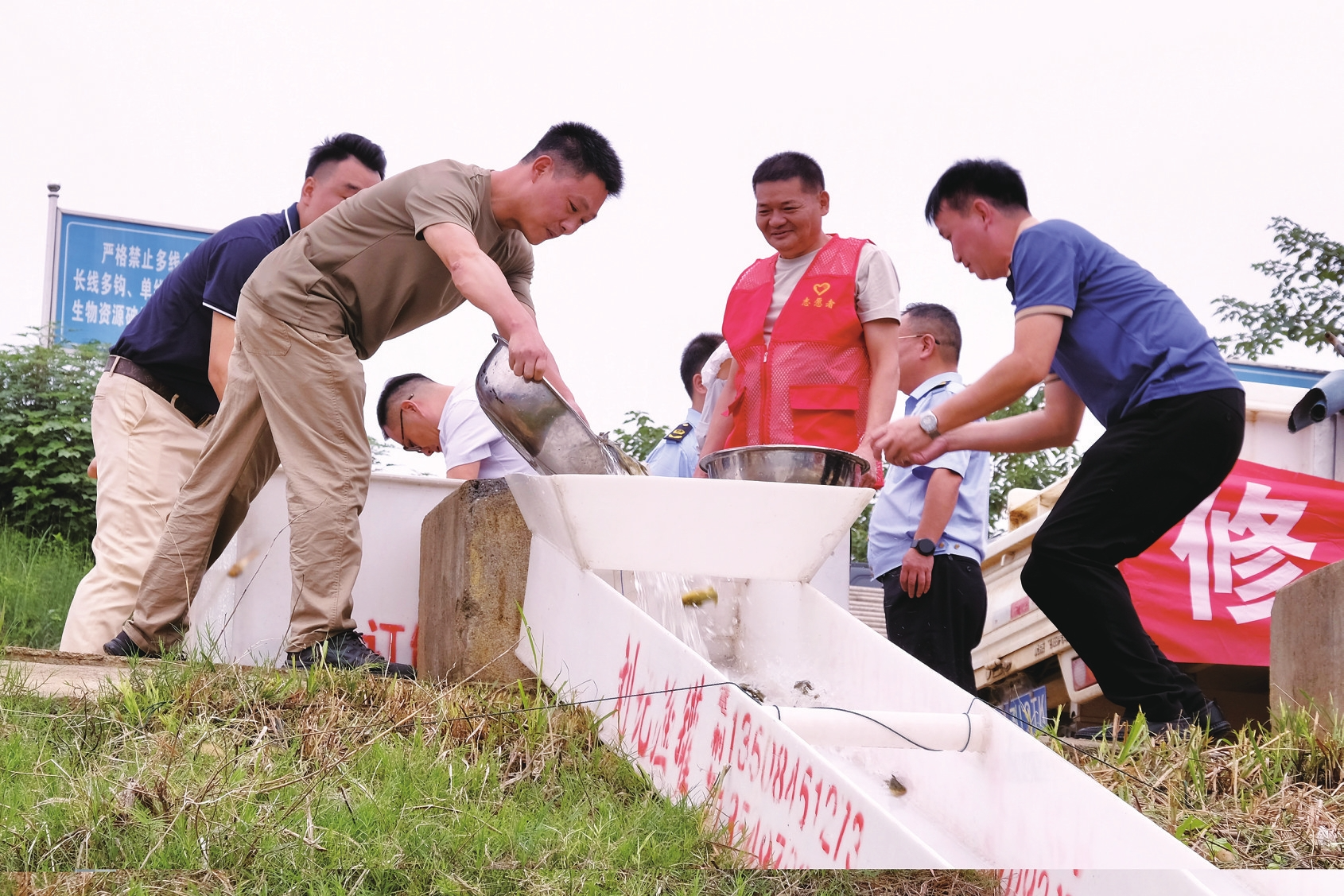 当天上午,在区渔政码头(资水黄颡鱼保护区核心区),一辆满载鱼苗的专用运输车抵达岸边。工作人员将6米长的投放槽一端连接运输车水箱,另一端伸入江中,鱼苗顺着槽管涌入江中,游向水域深处。此次放流的783万尾鱼苗价值近50万元,包括青、草、鲢、鳙等淡水广布型经济物种,以及黄颡鱼等区域性物种,兼顾生态修复与资源保护双重需求。