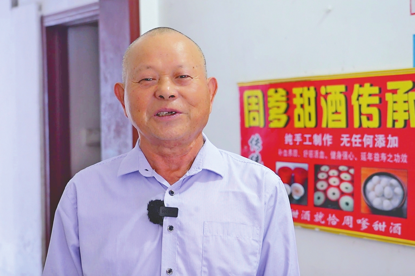 后来,许多年轻人选择外出打拼,周国泉却选择留在家乡:“大家都往‘钱’看,我偏偏往‘前’看,守着我们老祖宗留下的好东西。”正是这份执着,让他在最困难的时候也没有放弃甜酒酿制:没有现代化设备,他就自己设计制作工具;没有稳定销售渠道,他就骑着三轮车走街串巷;没有人理解,他就默默坚守,用一缸缸醇香的甜酒证明自己的选择。