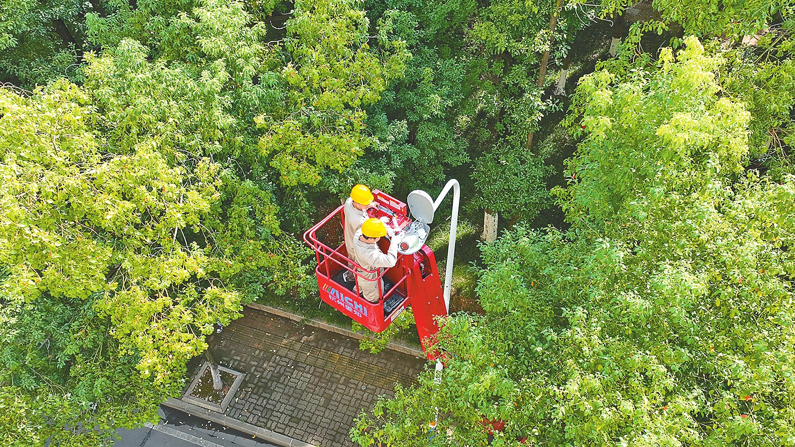 ▲路灯工人忙着抢修会宾路路灯。刘青摄