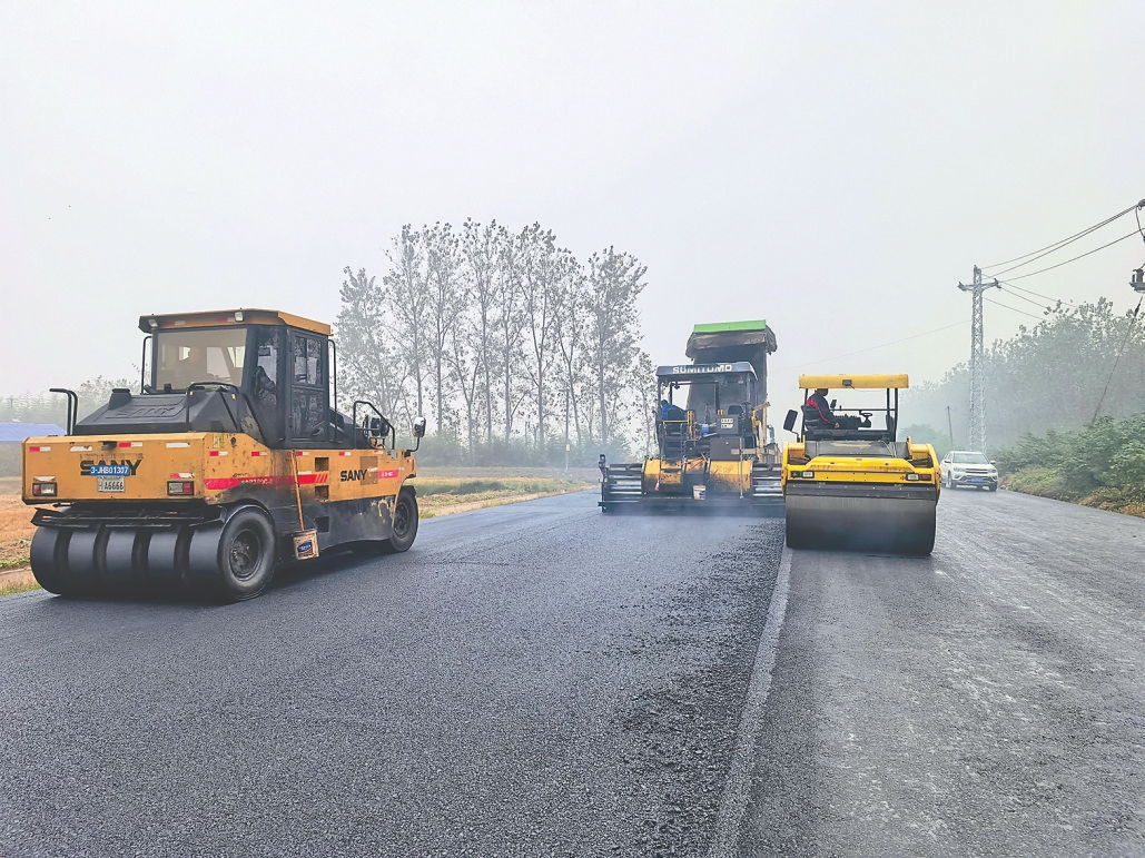 摊铺沥青。