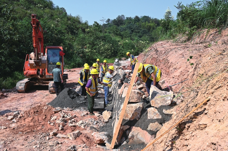 ▲工人对填方渠道险段进行除险加固。刘美玲摄