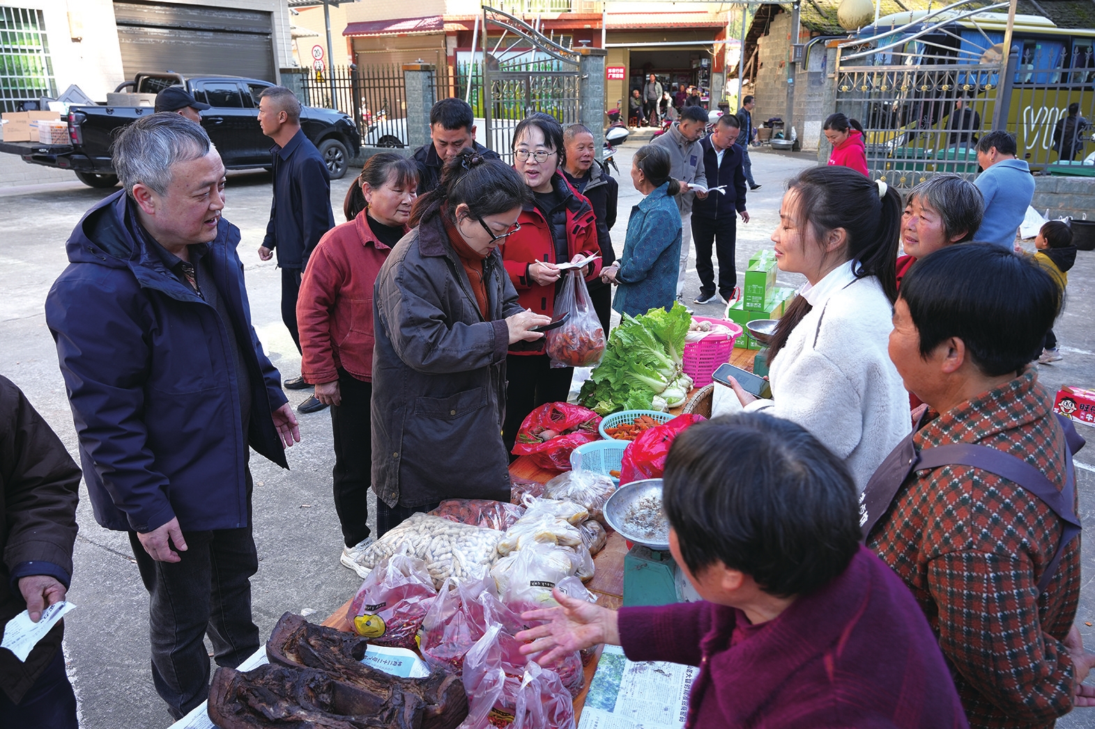 广场上的展销会俨然成了“乡村赶集日”。竹簸箕里的茶叶茶香四溢,陶桶里的菜籽油泛着金色的光芒,竹筛里的白辣椒、腊肉透着农家烟火气……村民邓姐的摊位前热闹非凡,她麻利地为顾客装袋,额头沁出细汗也顾不上擦:“好吃的乡下豆腐,5块钱两块,腊肉都是正宗的乡里腊肉!”不远处,镇干部正帮着维持秩序,教职工们举着手机拍视频、问产地,热闹的交谈声在山村里回荡。