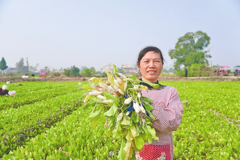 “水晶萝卜的生长周期短,一个多月便可采收,而且病虫害少,全程无需农药,是绿色无公害作物。”李建华介绍,水晶萝卜亩产可达750至1000公斤,收获后由村里统一进行粗加工。目前,村集体已与食品企业湖南邬辣妈农业科技发展有限公司达成合作意向,产品验收合格立即收购,销路稳定,700亩水晶萝卜预计可为村集体经济增收30余万元。更让村民们欣喜的是,从播种、采收到粗加工,基地每天吸纳30至40名村中闲置劳动力参与种植管理。村民龚喜明高兴地说:“就在家附近做工,家里的事情都顾得上,一天还能赚100多块钱,比闲着强多了!”