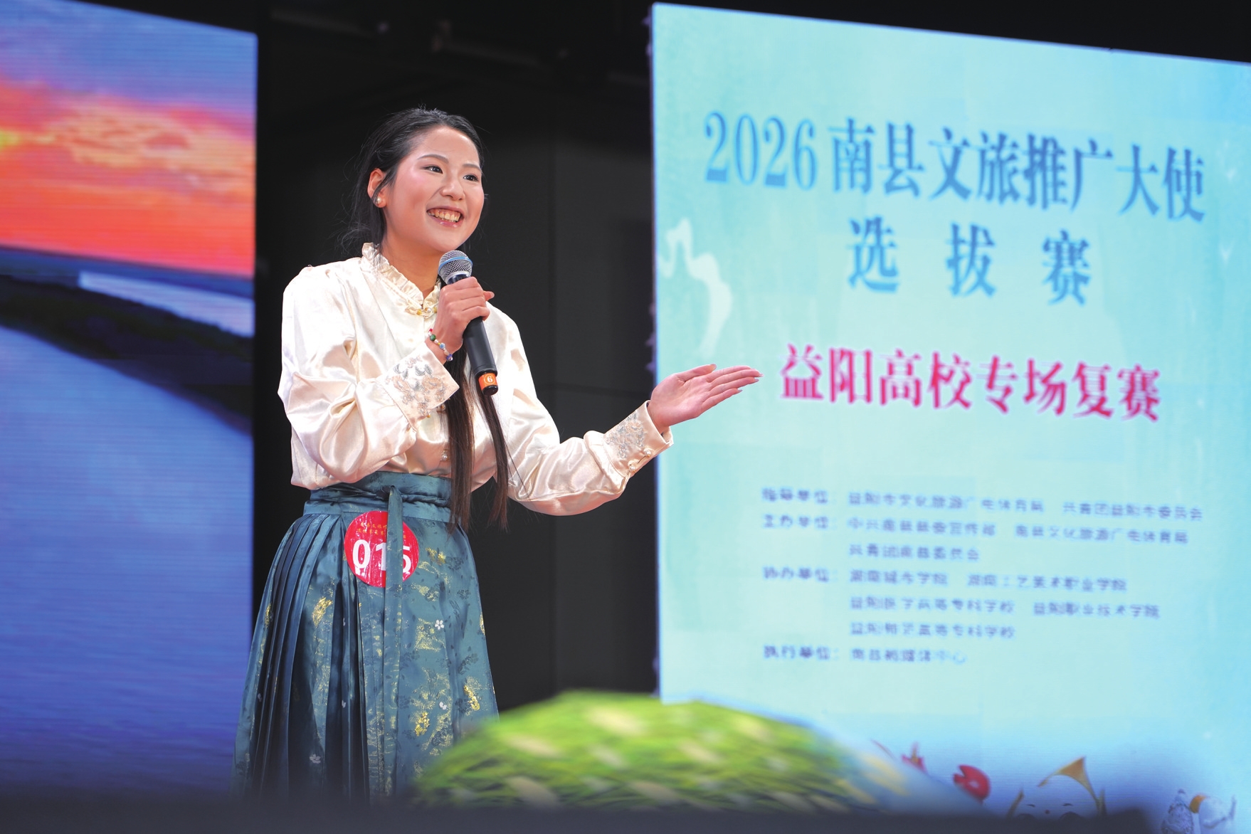 比赛中,选手们通过舞蹈、歌曲等多种形式展示才华。来自湖南城市学院的选手王语馨以一段古典舞《新意欢》获得全场评委一致认可,率先拿到晋级名额。“到现在还有点紧张,但更多的是晋级决赛的激动。”王语馨赛后表示,她打算到南县各处去走走看看,为决赛做准备。