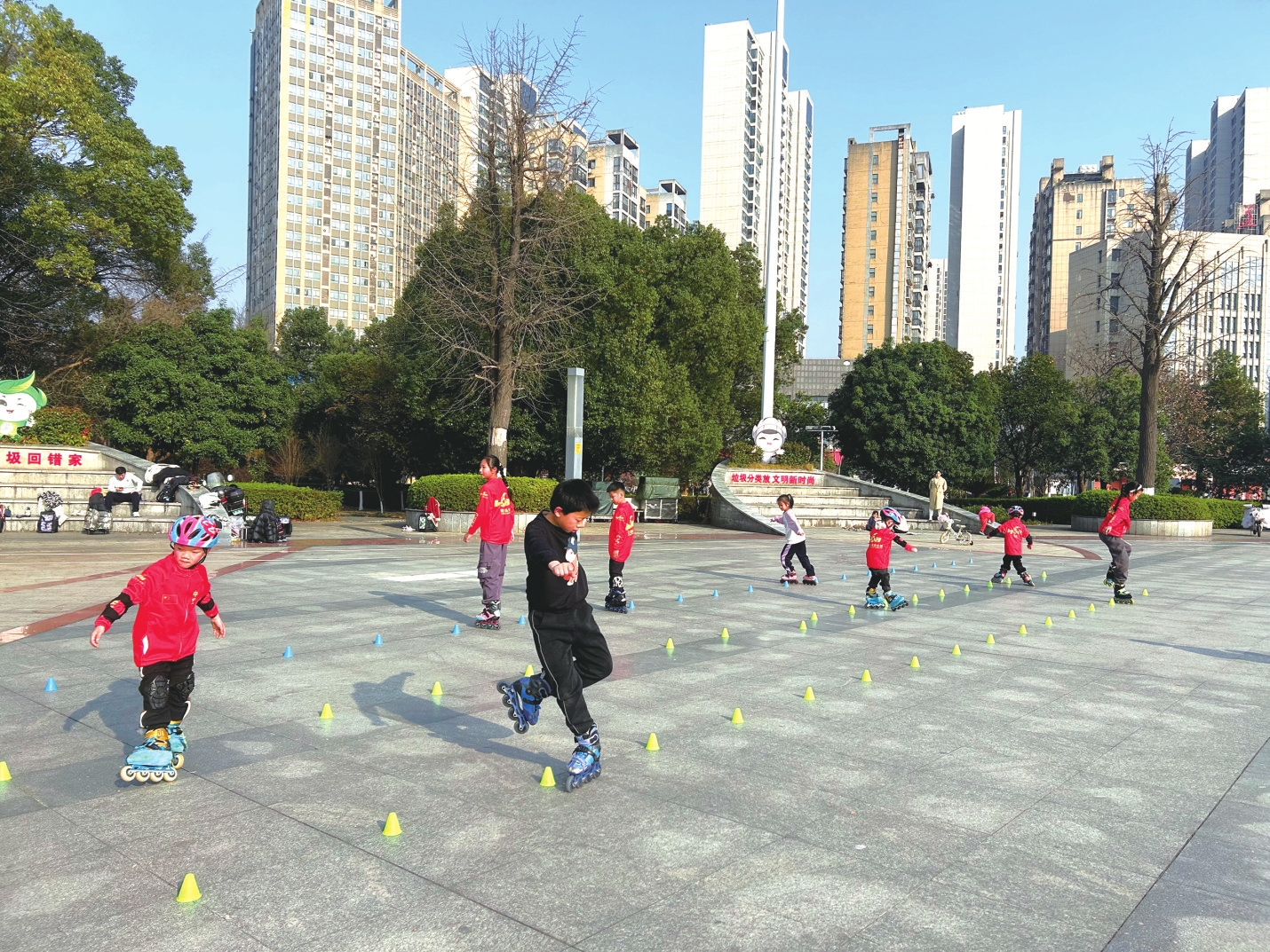 连日来,我市天气晴好,市民纷纷走出家门拥抱阳光。漫步在大街小巷,公园里、广场上、河岸边,随处可见跑步、打球、骑行的市民,晴好天气点燃全民健身热潮。图为小朋友在佳宁娜市民广场练习轮滑。