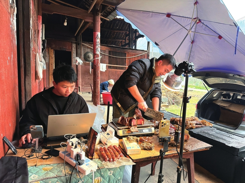 主播高齐的直播间设在一栋老木屋前,他对着镜头掂了掂一块腊肉,声音洪亮且富有节奏:“大家看看这品质,瘦肉与肥肉相间,足斤足两的4斤肉,现在上车!”他和兄弟高君涵搭档从事直播带货,摸透了流量规律,避开晚间大主播锋芒,专攻上午和下午的黄金时段。2024年从湖北转战安化后,高齐的月收入翻了一番,生活更有盼头。这是产业兴旺带给从业者的真切红利。