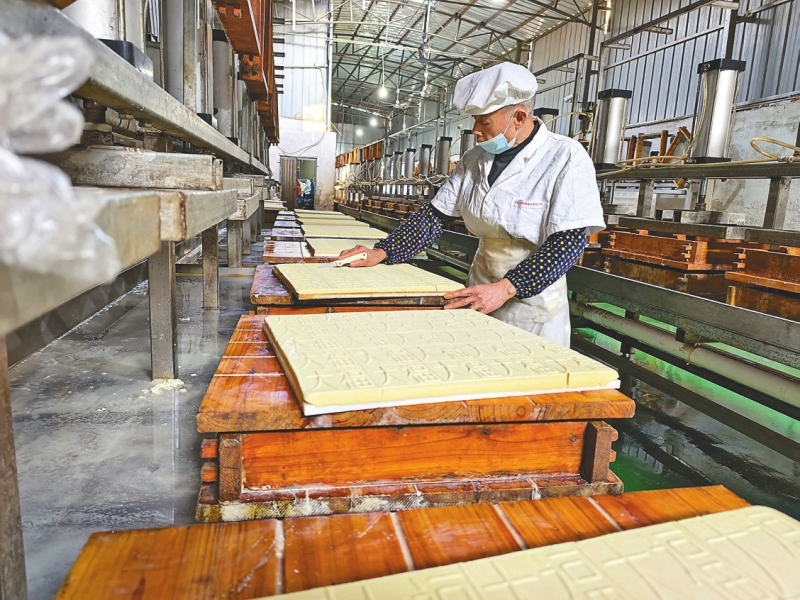 1月20日,位于安化县大福镇的湖南沂溪生态农业有限公司帮扶车间内工人们正在有序忙碌着:有的将豆制品整齐码放在金属烤架上,有的在木台上分拣、规整带花纹的豆腐。据悉,该帮扶车间通过直接提供就业岗位或开展产业合作等形式,累计帮扶周边群众300余人,产品远销长沙、深圳等地。