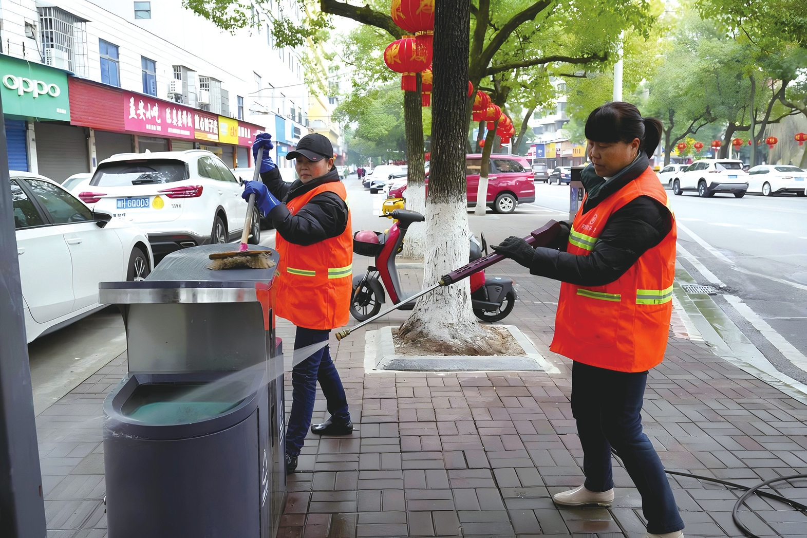 “机械车辆帮了大忙。”蔡建华指着路面说,“像马路中间,机器扫起来又快又干净。我们就能腾出手来,专攻边边角角。”她所说的“边角”,正是环卫工作的“最后一公里”——机器进不去的卫生死角、路缘石缝隙、犄角旮旯,都得靠人工一点点清扫。蔡建华把街巷当作自家院子打理,弯腰捡花丛烟蒂,抹布擦果皮箱,边角污渍也绝不放过。她边打扫边说:“过年就图干净舒心,路面干净了,大家走街串巷才更有精气神。”
