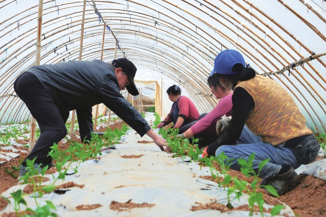 高级农艺师张海林指导农户为刚移栽的辣椒苗做好套管、铺设滴灌带。刘馨予摄