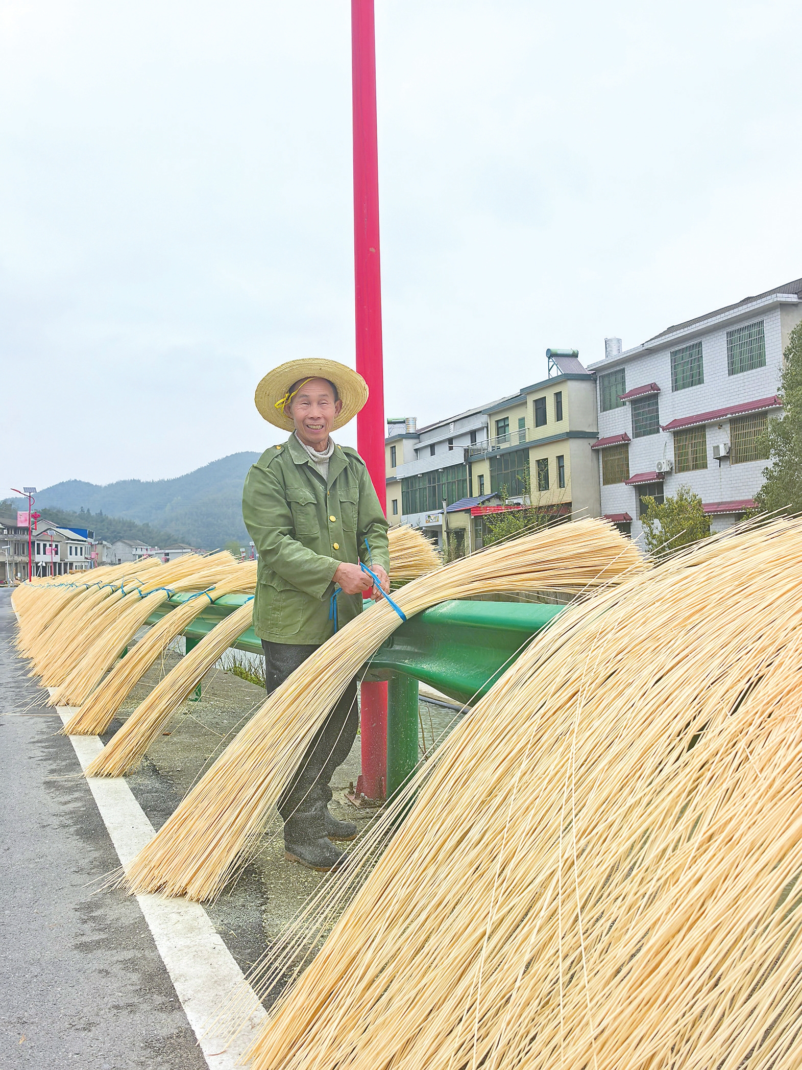 3月21日,桃江县鸬鹚渡镇花桥村的公路旁,晒满了竹篾条。70岁的夏爹在打捆晾晒好的竹篾。他告诉记者,他家就在离篾厂不远的邻村,天气好时到篾厂打点零工,一年也能挣个2万多块钱。杨治军 摄