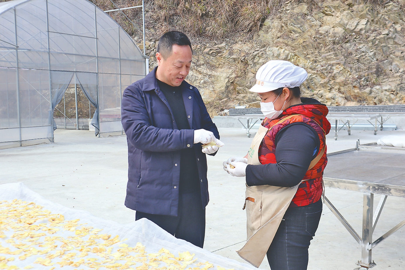 李定球(左)与村民交流黄精加工情况。刘馨予摄