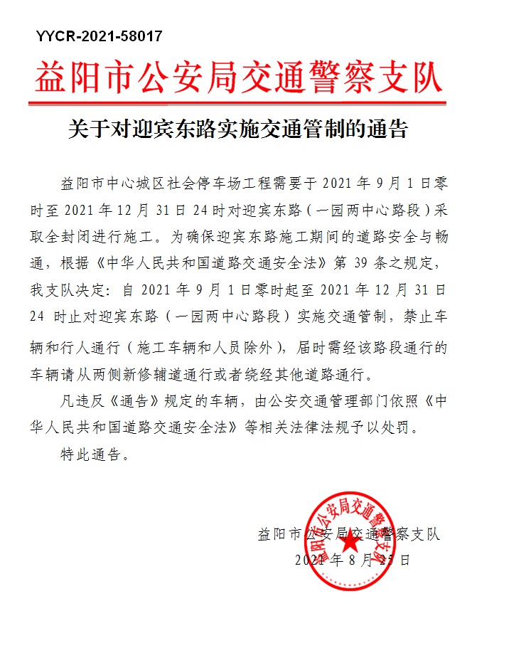 关于对迎宾东路实施交通管制的通告(YYCR-2021-58017)